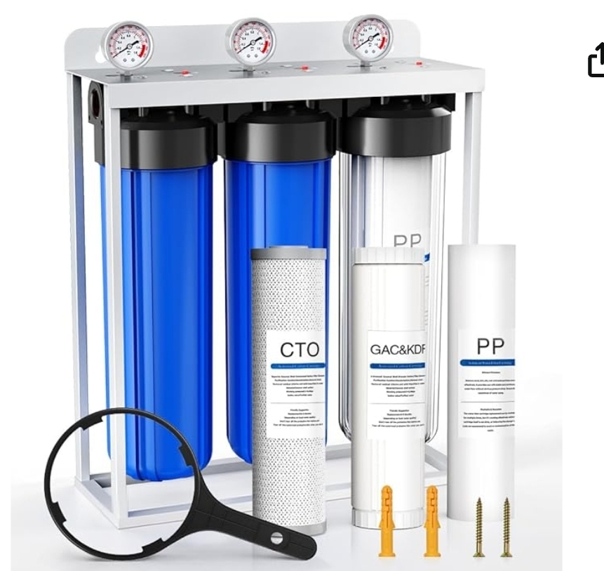 Clean water is a necessity for every home, not just for drinking but also for cooking, bathing, and protecting household appliances. The Whole House Water Filter System with its advanced 3-stage purification process is designed to deliver safe, great-tasting water for the entire household. Built with durability and efficiency in mind, this system is a reliable solution for families who want to improve their water quality.Advanced 3-Stage FiltrationThis water filter system uses a multi-layered purification process that significantly reduces contaminants while improving taste and odor:1. Sediment Filter (20 x 4.5 Inch): Captures rust, sand, dirt, and other visible particles, preventing them from reaching your taps and appliances.2. KDF + GAC Filter: Uses Kinetic Degradation Fluxion (KDF) combined with Granular Activated Carbon to target heavy metals like lead, arsenic, and chromium, while also reducing chlorine and other chemical impurities.3. Carbon Block Filter: Enhances taste and odor by absorbing residual contaminants, ensuring your water is crisp, fresh, and clean.Removes Up to 99% of Harmful SubstancesThis filtration system is specially engineered to remove up to 99% of heavy metals, chlorine, and chemical pollutants. It addresses one of the biggest concerns in tap water—toxic metals and harmful chemicals—making your water safer for long-term health.Whole-House ProtectionUnlike single-point filters that only purify water at one faucet, this whole-house system ensures every tap, shower, and appliance receives filtered water. That means better quality for everything from drinking and cooking to bathing and laundry. It also helps extend the lifespan of dishwashers, washing machines, and water heaters by reducing sediment buildup.Improved Taste and OdorMany households struggle with chlorine taste or unpleasant odors in their tap water. Thanks to its carbon-based filtration, this system eliminates those problems, delivering water that tastes fresh and smells clean—perfect for daily hydration and cooking.Built for Durability and EfficiencyThe 20 x 4.5-inch filter cartridges provide long-lasting filtration with a high flow rate, ensuring your household always has access to clean water without pressure drops. Its heavy-duty design makes it a reliable investment for years to come.Why Choose This System?3-stage purification for maximum contaminant removalHighly effective against lead, arsenic, chromium, chlorine, and odorsImproves water taste and clarityProtects appliances from sediment damageLarge 20 x 4.5-inch filters for high flow and long lifeFinal ThoughtsIf you want to safeguard your family’s health, improve your water’s taste, and protect your home appliances, the Whole House Water Filter System with KDF + GAC and carbon filtration is a top-tier choice. It combines advanced filtration technology with durable design, giving you peace of mind and consistent access to clean, fresh water throughout your entire home.