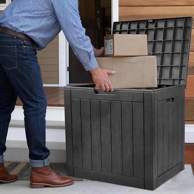 This 35-gallon deck box can serve as a practical and secure delivery drop box. Placed near the front porch or entryway, it protects packages from rain, wind, and direct sunlight. The simple and neutral design keeps it discreet while adding functionality to your home.
